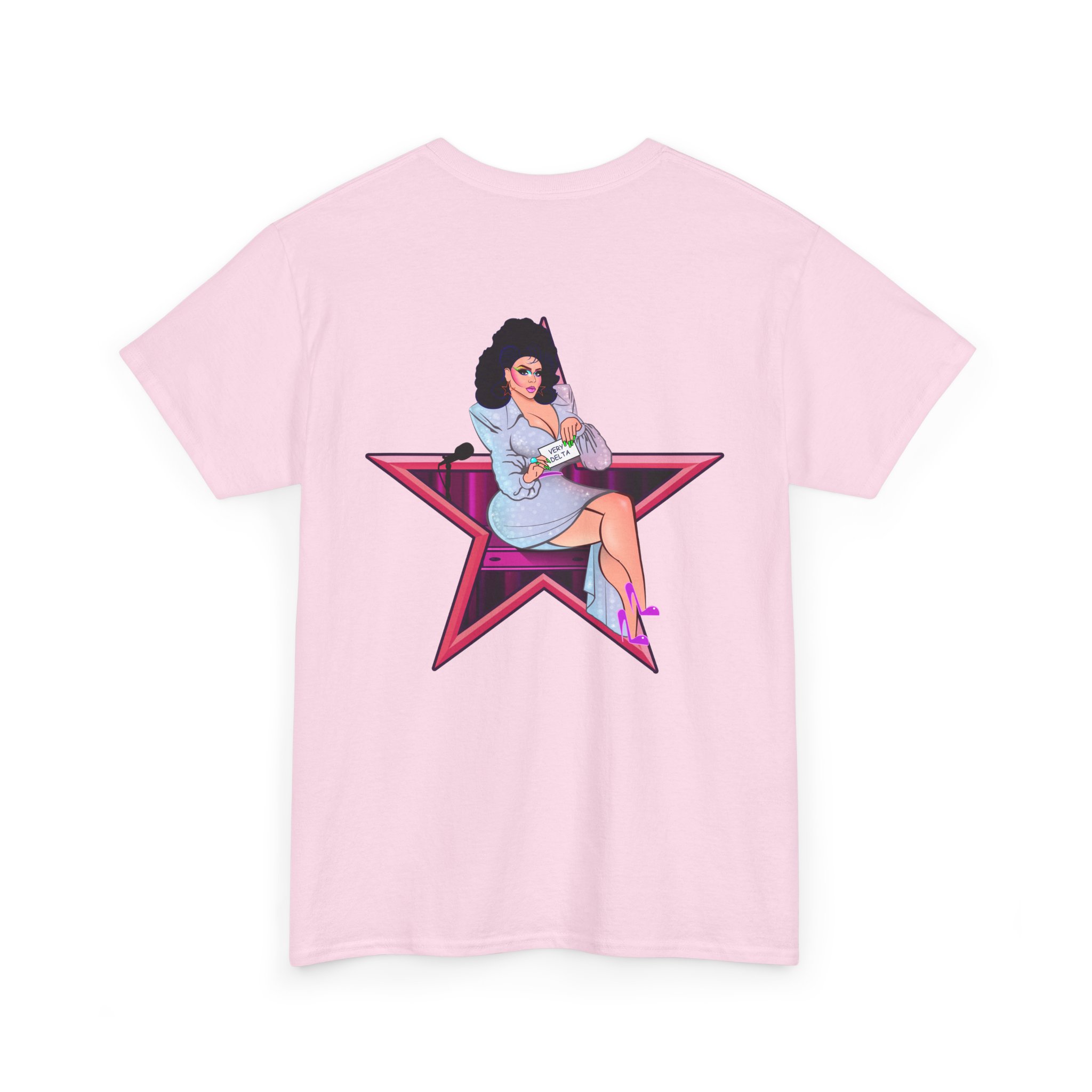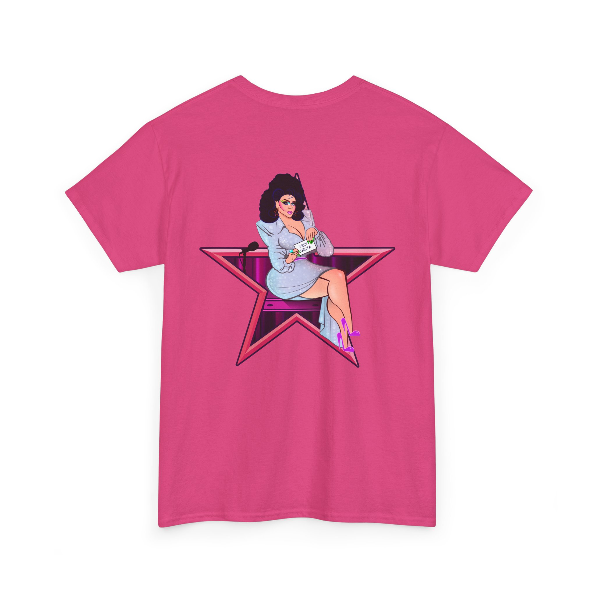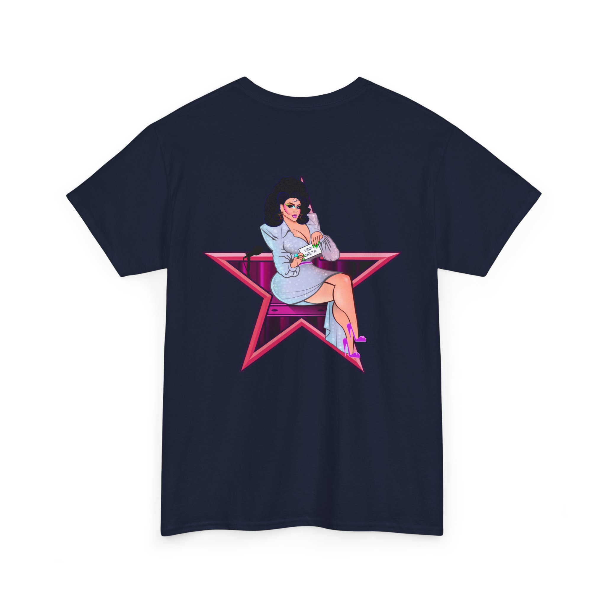 Elevate your wardrobe with this thoughtfully designed unisex t-shirt, a sartorial homage to the Very Delta podcast and its inimitable host, Delta Work. Featuring a striking star motif with Delta seated at a desk, clutching her iconic notecards—symbolizing the spontaneous yet incisive commentary that defines the show—this shirt is a must-have for aficionados of intellectual humor, queer media, and pop culture critique.